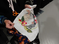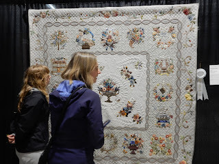 On the weekend, I attended a quilters' exhibit, and as you might guess from the photo above, I wasn't the only one amazed by what I saw. If you click on the photo you might be able to tell that the images on the white background are bits of applique. It's an art that confounds me; I can't imagine needlework that could be more demanding.