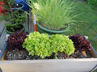 One of the best ways I've found of working around the many varieties of lettuce from California has been the discovery of 'living lettuces' that are grown here. Not only do they last longer in the fridge, because they already have a well-established root ball beneath the leaves, they're super-easy to plant! All you need to do, once you've used the leaves is ensure there's still about an inch or so of greenery above the roots and stick the whole thing into soil. The 'salad bar' above is the result of just such 'recycling' and pretty much ready for harvest (at which time I'll do the same procedure again).