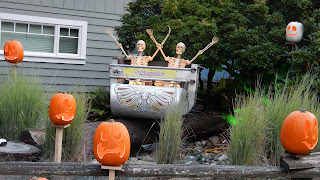It won't be long until Halloween is here, and what do I have for decorations? Nothing besides a pumpkin who still doesn't have a face. Luckily, we have neighbours who make up for these shortcomings. Even the skeletons look excited.