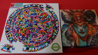 Both of those puzzles were gifts I received at Christmas, but I haven't started either one of them. The round one, with 500 pieces looks challenging, but possible. While the beautiful Avatar-like image on the other is tempting, its 1,000 pieces leave me hesitant to even open the box, as 750 is my usual maximum. Still, with a new month approaching, the time may be nigh for new horizons with bigger challenges.
