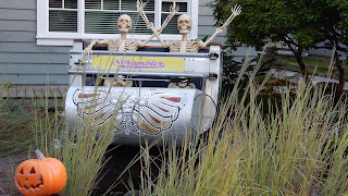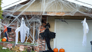 Every year, it seems that more people in our neighbourhood decide to decorate their yards for Halloween. Tonight, the one in the photo above even has scary sounds emanating...Ooooooh, scary stuff!