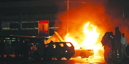 the public started throwing rocks at the police and police vehicles parked outside the police station. The result was that a car was burnt and another vehicle also caught on fire. The police response was to fire teargas to disperse the angry crowd.