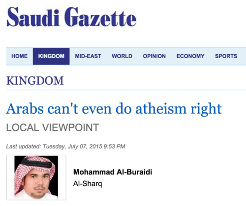 The Saudi Gazette — an English-language paper — has given up on the latter part of that equation. They just published an essay by Mohammad Al-Buraidi that’s just a long tirade against Arab atheists. Not all atheists. Just Arab ones. Because they suck. And they suck, Al-Buraidi argues, because he said so: