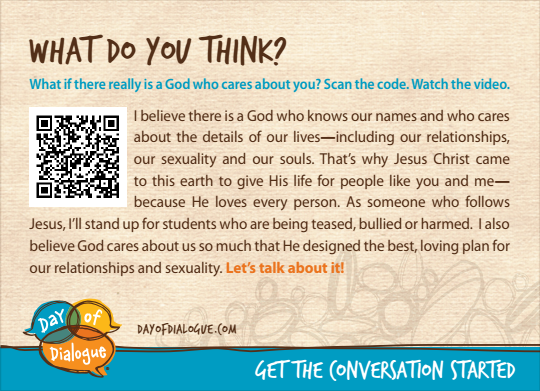 Tomorrow marks the annual Focus on the Family-sponsored “Day of Dialogue” in which participants can tell their LGBT classmates why they’re going to hell. (It’s a Christian response to the Day of Silence which takes place on Friday.)