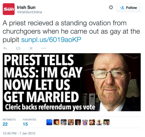 In Dublin, Ireland, where a referendum on gay marriage will be taking place this May, Father Martin Dolan of the Church of St Nicholas of Myra told his congregation on Saturday night (and Sunday morning) that he was gay: