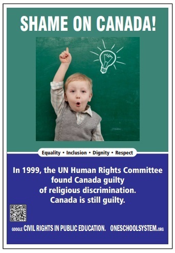 It is embarrassing and disgraceful to be told by the UN Human Rights Committee that Canada/Ontario is guilty of religious discrimination. Hopefully these ads will encourage others to speak out and join the growing number of Canadians who think it is time for our government to treat all citizens equally… It is shocking that Pattison Outdoor arbitrarily denied my right to express my view on the one-school-system concept, a view that has been expressed numerous times in editorials and opinion pieces in newspapers across Ontario in recent months. I am presently considering my legal options.
