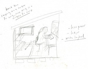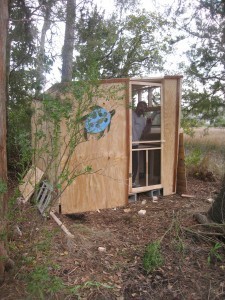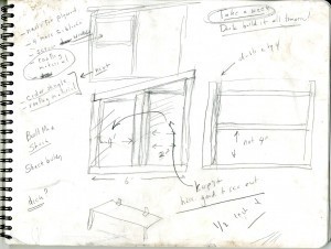 If back then I saw carpentry as a metaphor for writing, this past week I used writing as a metaphor for carpentry. When I set out to build the shack, there were more than a few practical problems, problems that I had no idea how I was going to surmount. I had vowed not to write for the week and the night before I started I did the same thing I often do while writing: woke up at 3 and had ideas. Only these weren’t words, but little drawings in my sketchbook, drawings of what I would build the next day. Then I did something I would never do as a young man. I walked into Home Depot and schmoozed and brainstormed with the people there, who helped me solve a couple of problems. And I solved some problems on my own: like using a screen door turned sideways for the