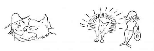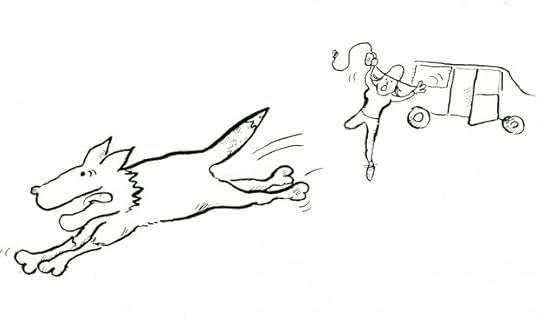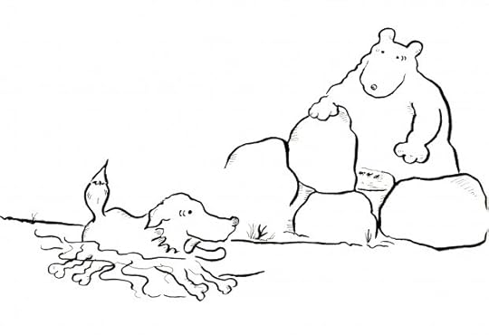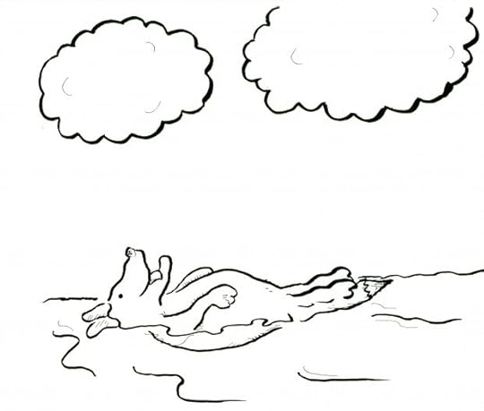 When Nina and I first met, over twenty years ago, she had a dog named Zeke. Zeke was part collie, part Saint Bernard, and while fiercely loyal to Nina (and eventually me), he tended to be pretty ornery to others. In those days Nina and Zeke were always together, and it was only natural that when she set out to write a children’s book her subject was Zeke. I just cleaned out the garbage and found that old book, though she won’t let me re-print it here. But I will re-print the drawings I did to accompany the story of the day Zeke floated downstream.