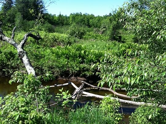 We got in the car and drove over to Stony Brook. The day before it had rained heavily, and the brook was pouring downstream in great silver surges. The just-budding green of the briars was highlighted with blood red, and insects rose up from the water like silver flashes at the edge of vision.