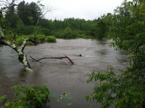 We get ‘em in Maine spring and fall, these days of hard rain and then the floods. The old timers called them freshets. A famous fall one was the pumpkin freshet of 1868, when high water took out all the Sandy River bridges (a tradition–quite a few have gone down over the years) and stripped the fields of pumpkins, which took off in the thousands and filled the ponds behind dams downstream. Consensus was to fish them out and divide them up among the farmers. I took the photo above the other day in high spirits and sunshine and low water, just a scruffy spot over a beaver canal, Temple Stream back behind and out of sight. t I took the photo below 24 hours ago after wading up to my thighs where the path used to be, Temple Stream ascendant. It has not stopped raining since. I could get a shot of even higher water, but I’d have to swim.