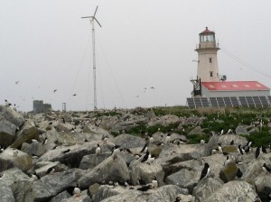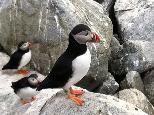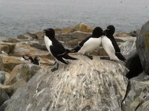 fliers. They put their orange feet forward to land, and stumble when they hit the rocks. They look worried, something about the markings around their eyes. And they make a sound like distant chainsaws. There were thousands of them on the fog-bound day, thousands. Also other alcids–the Razorbills primarily, very handsome birds in black suits with white piping. The alcids reminded me of penguins, and they fill a similar ecological slot, ranging the polar seas and diving deep for fish. But unlike penguins, they can fly in the air, and not only the water.