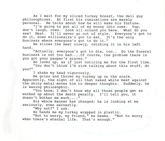 And how about writing about your children? Fascinating. Especially those that end up in jail or worse. But how do you do it? You make angels of them, that's how. Everyone will understand. And that one flaw can be slipped in as a compliment of sorts. "Riley was a genius with firearms, the best in his class, and the most tattooed. Even without teeth his smile was winning."