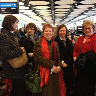 Photo by Sarah McIntyre At Heathrow 24th March 2013It starts Day One minus one really, as large numbers of publishers, agents and a small sprinkling of writers and illustrators gather at the airport on Sunday. In this picture you see Liz Cross from OUP, Christine Baker from Gallimard, myself, Jane Churchill, who organises the Cheltenham Book Festival and scouts for Gallimard, and fellow author and Fair Companion Lucy Coats. Whacky artist (of which more below) Sarah McIntyre took the shot.