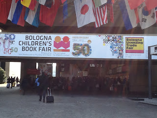 We also saw writer Philip Reeve, illustraor Axel Scheffler, agents Catherine Clarke, Claire Wilson and Sophie Hicks and publishers Fiona Kennedy, Helen Boyle and Ingrid Selberg. On the plane I sat next to agents Sarah Molloy and Jennifer Custer from A M Heath and had plenty of time to chat as we waited for an hour for an unaccompanied bag to be taken off the plane. Surely no-one in the children's book world would have gone to the bar at 3pm and become too tired and emotional to board the plane for Bologna?