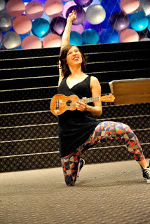 Because this (on the right) is how the RSC has chosen to cast the Bastard, the older son remember. Pippa Nixon. She opens the production, in her mini-dress and patterned tights, with this tiny guitar, plucking out the notes of Land and Hope and Glory and encouraging the audience to join in, saying she "didn't know the words."