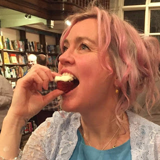 Launch number two was celebrated with prosecco and canapes and tiny cupcakes featuring the book's cover. This took place in Daunt's, Marylebone High Street and the author, Kathryn Evans, had also overcome a great deal to reach this eventual triumph.Here's a picture of Kathryn consuming one of said cupcakes: