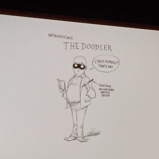 • Speed - Chris is a fast worker. He has pledged and is already fulfilling that pledge to draw at least one picture a day of his laureateship, making a unique visual journal of his years in office. He's doing it in a beautiful book given him by his mother. My only worry is that Chris's mum should have made it a bigger book.