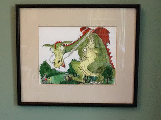 Chris's cartoon of Malorie Blackman* I really can't be modest myself about the fact that Chris has illustrated two of my books. In fact Beware, Princess! (1986) might just have been his first professional commission for a trade book. Here is the dragon from that book, now displayed on the wall of my study.