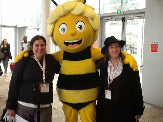 Rhiannon Lassiter and Frances Hardinge with a beeAs well as all the agents and publishers (no authors) we found at Heathrow, we bumped into old friend Lawrence Schimel on the bus from Bologna Airport to our hotel. Rhiannon and I first met Lawrence at Bologna in 2003 when we were compiling our fastest ever book, the anthology Lines in the Sand (Frances Lincoln 2003). We included one of his terrifying, excellent poems looking at the Shoah through a fairytale lens; that was his Hansel and Gretel, with a very different kind of oven at the end. Now he has published a small volume of poems called Fairy Tales for Writers, which he gave us:Like the prince supplicating