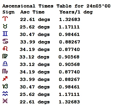 For example, below are the ascensional times of the tropical signs, calculated in Janus 5 software (not surprisingly modern values done by computer based on the tropical zodiac differ somewhat from the times used by Valens for Klime 2, possibly based on the constellation zodiac):