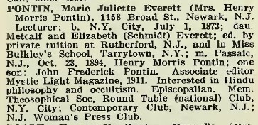 Marie Juliette Pontin was a well-known New York astrologer in the early 1900s. According to Who’s Who in America, 1914 ediction, which lists her as a “Lecturer,” she was born Marie Juliette Everett in New York City on July 1, 1873. She married Henry Morris Pontin (1871 – 1927) on October 23,1894 in Passaic, N.J., and the couple had one son, John Frederick Pontin. In 1911, she became associate editor of Mystic Light Magazine. Her interest in Hindu philosophy and occultism prompted her to join the Theosophical Society. In 1924 she published A Manual of Astrology: Planetary Aspects and Transit Effects, which contains the material found in the book attributed to Dr. Smith and some additional text.