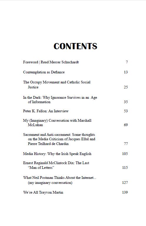 Long-term followers of IN THE DARK (there ARE a few, you know) will remember that my blog productivity drops whenever I'm working on a book, as it did with The Metaphysics of Media (which won the Lewis Mumford Award for Outstanding Scholarship in the Ecology of Technics for 2010) and Why the Irish Speak English (Winner of the Marshall McLuhan Award for Outstanding Book in the Field of Media Ecology for 2007). So my output on IN THE DARK has been pretty spare in the last year or so as I worked on my third book, a collection of essays titled Cultural Defiance, Cultural Deviance. CD/CD is a set of ten essays I've written over several years, some written as peer-reviewed articles and presentations, some written as nothing more than flights of imagination, but all with a nod to the notion that, if reality is a socially-constructed phenomenon, we ought to have a hand in the process and not out-source that construction to multi-national infotainment corporations. While CD/CD is out only a week, it has garnered some praise from early reviewers:To the names of McLuhan, Postman, Ellul, and Ong, please now add Peter K. Fallon. This isn’t so much a book as it is a placeholder for polymaths. This isn’t a collection of essays unified by a theme or subject, but rather a collection of discrete objects subjected to the same methodology. They are historical, analogical, probing, semantic, linguistic, and psychological. And not religious but spiritual, in the best sense of that beaten dead horse… If you read the essays collected herein, even some of them, you will have committed the cultural heresy of the title. You will have committed the act of contemplation, in defiance of the noise, rush, bright colors, and distraction from the unmitigated disaster of technological society’s clustercuss all around you. And that will be a deviant thing to do. –ReadMercer Schuchardt, Wheaton College (from the Foreword) Neil Postman suggested that all of the social and behavioral sciences would be best understood as a form of moral theology. Without a doubt, he would have heartily approved of this well-written and thoughtful collection of essays by Peter K Fallon, who writes in the tradition of Jacques Ellul, Walter Ong, Marshall McLuhan, and Postman himself, and brings deep insight, grounded in the media ecology intellectual tradition, coupled with a sharp wielding of ethical criteria, to matters of contemporary and universal human concern. – Lance Strate, Professor of Communication and Media Studies, Fordham University Both a student of renowned Communications theorist Neil Postman and the winner of the Media Ecology Association's Lewis Mumford Award (named for Postman’s own intellectual hero), Peter K. Fallon is the perfect tour guide through our techno-mediated environment. He adheres scrupulously to Postman's conception of media ecology as nothing less than an exploration of the ways in which our communication habits and technologies enhance or impede our chances for survival… In the words and spirit of Jacques Ellul--one of the intellectual heirs Fallon pays homage to in the book--"Contemplation as Defiance/Deviance" is "a call to the sleeper to awake." – Eric Goodman, Producer, Composer, Performer: Thus Spoke the Spectacle For nearly two decades, Peter K. Fallon worked for NBC News. Today, he is a media scholar and a powerful critic of the television he once produced… These essays by a writer of conscience and acute observation insist on the continuity between our media and our moral lives. Fallon’s evident passion for the potential of media, and his pointed criticisms of the moments when television and other media betray their promise, affect all who read his thoughtful books. – Anne-Marie Cusac, George Polk Award-winning investigative journalist; author, Cruel and Unusual: The Culture of Punishment in America Here is a link to some quotes from the book on Goodreads, and here is the table of contents: