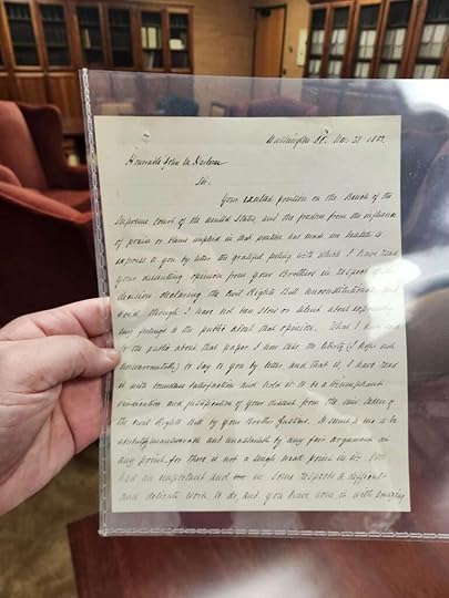 On Tuesday, I spoke at the Louisville Federalist Society Chapter about presidential immunity. After the debate, I was fortunate enough to visit the Library's special collections. The collection includes papers from Justice Louis Brandeis, the namesake of the law school, who is actually buried outside the building. The collection also includes papers from Justice John Marshall Harlan I. I have spent some time with Justice Harlan's papers at the Library of Congress. In 2013, I published a paper with Brian Frye and Michael McCloskey that transcribed Harlan's constitutional law lecture notes. (To this day, I use some of Harlan's lines in class–for example, when I tell my students that the Supremacy Clause is the most important provision in the Constitution; without it, everything else would fall apart.) Over the years, I've corresponded with Peter Scott Campbell, a librarian at Louisville. Campbell was kind enough to show me around the room.