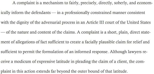 You can read the now-struck Complaint here. To be fair, the Complaint is a specimen of a broader phenomenon I've seen in other cases—but it is indeed an unusually aggravated specimen. These sorts of complaints, in criminal and civil cases, are sometimes called "speaking complaints," and have both defenders and opponents; this one, though, speaks a lot, and about many things that don't seem quite relevant to the matter.