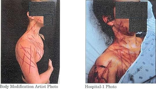 Individual 1 [the body modification artist] provided the investigators with photos of Greene that he took after the scarification had been completed on the afternoon of July 23, 2025, in his studio in Pennsylvania. The photos from Individual 1 reflect that the cuts made to Greene's skin by Individual 1, at Greene's request, follow the exact same pattern as the lacerations that were observed on Greene when she was found lying on the ground in the Egg Harbor Township Nature Reserve, as well as the lacerations that were observed on Greene and photographed at Hospital-1 later the same evening. The photo comparison is as follows: