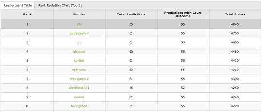 I am happy to announce that the Chief Justice is Kirill Muzyka. Players receive ten points for each correct prediction of a Justice's vote. We recorded 55 merits cases (DIGs do not count). A perfect score would have been 4,950 points. Kirill scored 4,840 points.