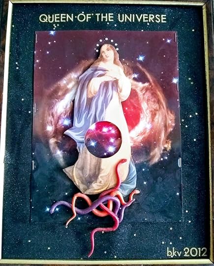 Although trained as a graphic artist, I had been away from art for a while when I found some tattered Catholic artwork at a garage sale. One was an image of the Assumption of Mary, showing her floating up to Heaven. There was actually a ragged hole in the image. I cleaned up the hole and placed her over a NASA photo of a nebula. Space is an image of God/Heaven that I find powerful. In this collage God/space shines through Mary in the area of her womb. She is crowned with seven stars in her role of Queen of the Universe. I put a lot of space snakes under her. Mary is often shown with her foot on a snake, a reference to the Garden of Eden. My version of Mary doesn’t step on a snake, but rises up to Heaven with lots of beautiful snakes!