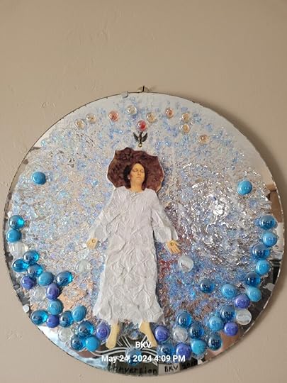 A few years later, I made “Conversion”, a mixed media representation of my conversion. I used a photo of my daughter, a mirror, bits of glass and glitter. This portrays the feeling of falling but being supported. I let go of my doubts and cynicism and float on a pool of infinite love. The Holy Spirit, in the form of a dove, is with me.