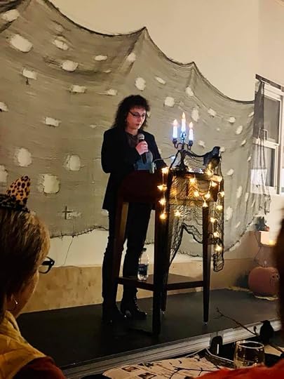 This Saturday I participated in one of my favorite events, Bainbridge Artisan Resource Network's(BARN) annual It Was a Dark and Stormy Night. Six authors, including me, Kevin O'Brien, Warren Read, Lynn Brunelle, Maureen McQuerry, and Erica Bauermeister, read short original works set to the theme of spookiness. There was a band, hors d'oeuvres, wine, Dark and Stormy cocktails, costumes, and lots of fun had by everyone.Thank you, Lynn Brunelle and everyone at BARN for some fabulous organizing. Here are a couple of pictures from the event:(Me (center), with good friends Lynn Beeman (l) and Jo'ell Catel (r))