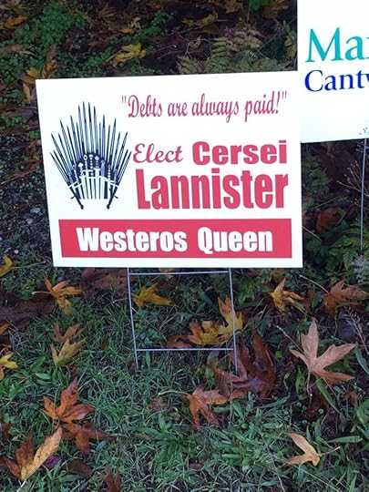 Whoever planted this sign is my new favorite person, which reminds me to urge all of you to VOTE TODAY! (Though perhaps not for Cersei Lannister).Please Vote. It is so, so important, whoever you vote for.