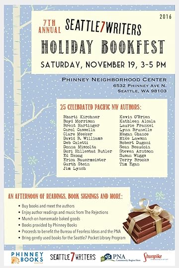 Hello everyone, this is just a quick shout-out to let you know that I'll be signing (and reading) at Seattle7 Writers Holiday Bookfest on November 19, 2016. This is a very fun event, with lots of authors, home-baked goods, and plenty of autographed books. A great way to fill your Christimas list--or your own personal "want" list! Be sure and save the date: