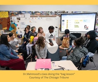 Finding creative ways to teach helps Mahmood reach students. She regularly assigns projects for her students. Some of her notable projects are news broadcasts, soap carvings, clothespin dolls, collages, mysteries, mock trials and debates. During the pandemic, she did almost every single project on Zoom that she used to do in class. Each quarter she dropped off a gallon-size bag with materials for the projects at students’ homes. Some supplies came from school funds while others were made or bought by her or donated by parents and neighbors. Instead of lecturing on history, she brings it to life. When her class studied the plight of refugees in Vietnam in the 1970s, she had her students pack bags filled with the items they would take if they were forced to leave their homes. Their discussion about their choices brought their revelations to the plight of refugees today.