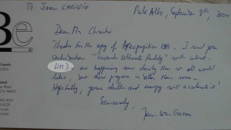 Now, I possibly did give the CEO of Be, Inc., Jeal-Louis Gassee a slight panic attack when I emailed him about some potentially fake Be, Inc. documents regarding a BeOS-powered AR gaming system. What I sent when he replied back were my own silly designs, and rather than being upset, it led to a discussion of the feasibility, and this hand-written note he later sent to me.