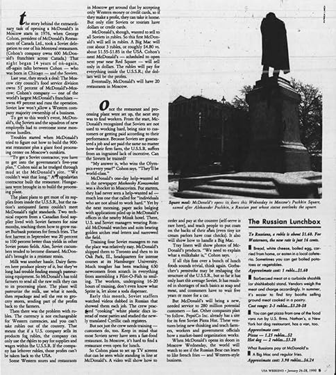 I wrote a few stories about the Moscow McDonald’s for USA Today and USA Weekend. Unfortunately none were digitized by either publication. One story, about the upcoming opening of the restaurant, was published through Gannett News Service in The Republic in Columbus, Indiana, on January 27, 1990 – thankfully preserved on Newspapers.com. The Republic didn’t run all of what I wrote, but here is the version that was in the paper that day.