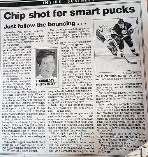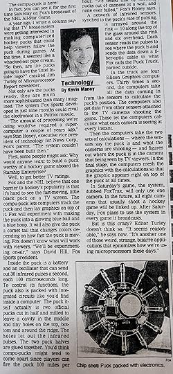 These are the two columns - in 1995 and 1996 - that I wrote about the electronic puck. Neither are available online.