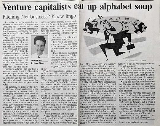 One reason we can know that B2B was first used around 1999 by VCs is that before 1999, VCs didn’t see a lot of business-to-business startup pitches. Christine Comaford, then of Artemis Ventures, sent an email to me that I quoted. She said: “I do believe that many of the b2c ideas have already been overexecuted (do we really need 30 sites to sell pet food/supplies?), but b2b is WIDE OPEN.”