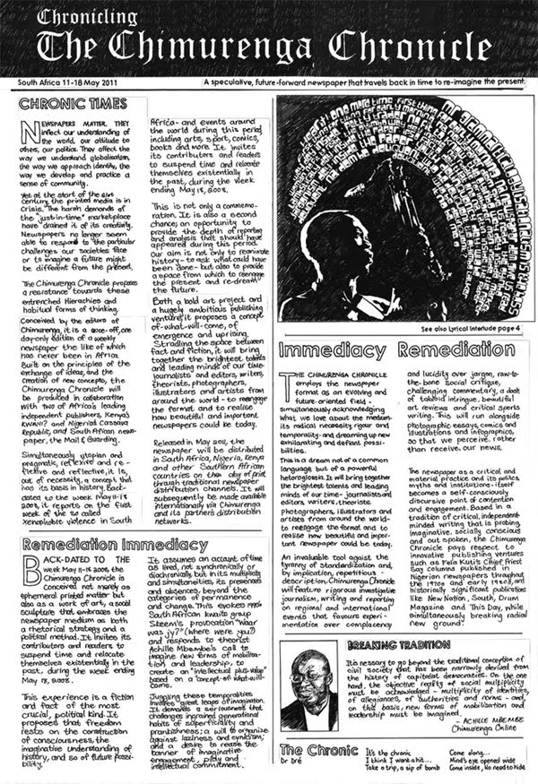 The Chimurenga Chronicle is one such machine. Back-dated to the week May 18-24 2008, it's situated during the first week of the so-called xenophobic violence in South Africa, two years ago – but it focuses outward, covering the events, scenes and situations around the world during this period.