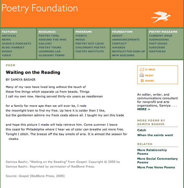 Click "Poetry" below to check out three poetry selections from Gospel: poems recently published online by The Poetry Foundation: