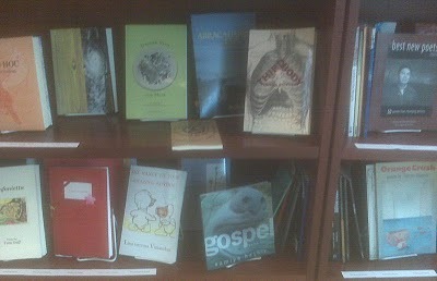 The sweet, talented, incredibly amazing Reginald Harris, recently sent me this pic snatched from the Poets House's Annual Poetry Showcase.Yep, that's Gospel prominently displayed right on the front shelf! Thanks, Poets House, for the showcasing joy and for inviting the world to rub itself all over my square-faced stone-puppy love.