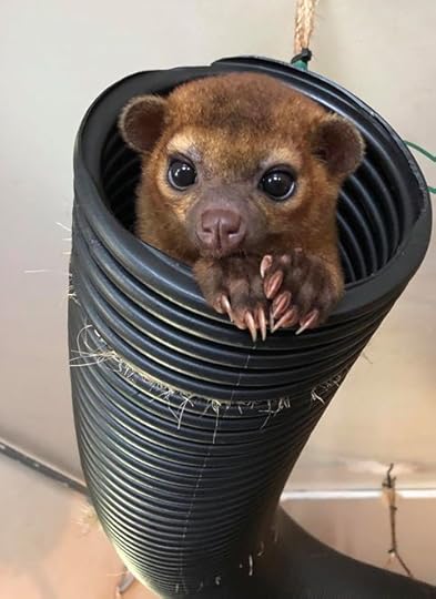 Six months prior she was found “thrown out” in a dumpster. This is a common practice regarding kinkajous; especially in Florida and Texas. People become overwhelmed with ownership and instead of finding placement, set them free in an inappropriate environment. Fortunately, TC was discovered and taken to a local wildlife sanctuary. She was rehabbed for 6 months and then joined Kinkatopia. We know nothing of her past before being found in the dumpster. Considering she ended up there, we imagine it wasn’t very nice.