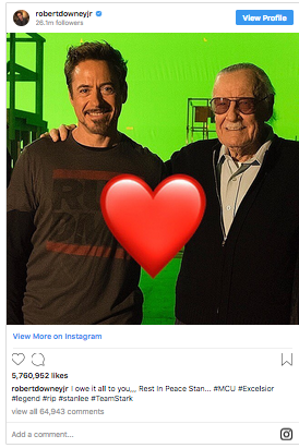 As you can see above, the touching tribute was posted alongside a photo of Downey Jr. and Lee. The photo, which was taken by Jimmy Rich, shows the men on the set of a previous MCU venture. Downey Jr. is seen in casual clothes as he channels his inner Tony Stark, and Lee stands next to the actor with an arm thrown over his shoulder.
