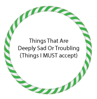 Finally, she told me to put other problems into a third hoop, the green hula hoop. This hoop is filled with things I find deeply troubling but cannot change. This actually gave me some peace because it allows for time to grieve over some of the things I find unacceptable.