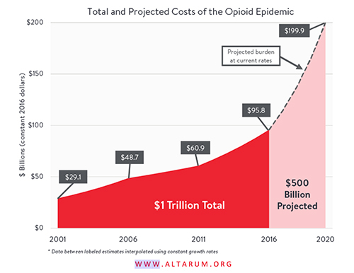 From CNBC by Dan Mangan The economic cost of the growing opioid epidemic topped an estimated $1 trillion from 2001 through 2017, according to an analysis released Tuesday.And the opioid crisis is projected to cost the United States an extra $500 billion through 2020 unless sustained action is taken to stem the tide, the report from health research and consulting institute Altarum said.