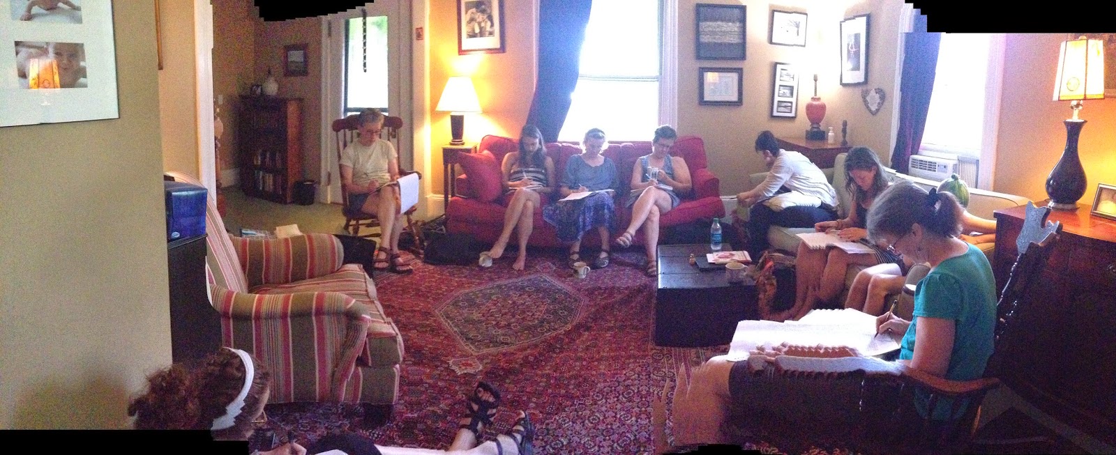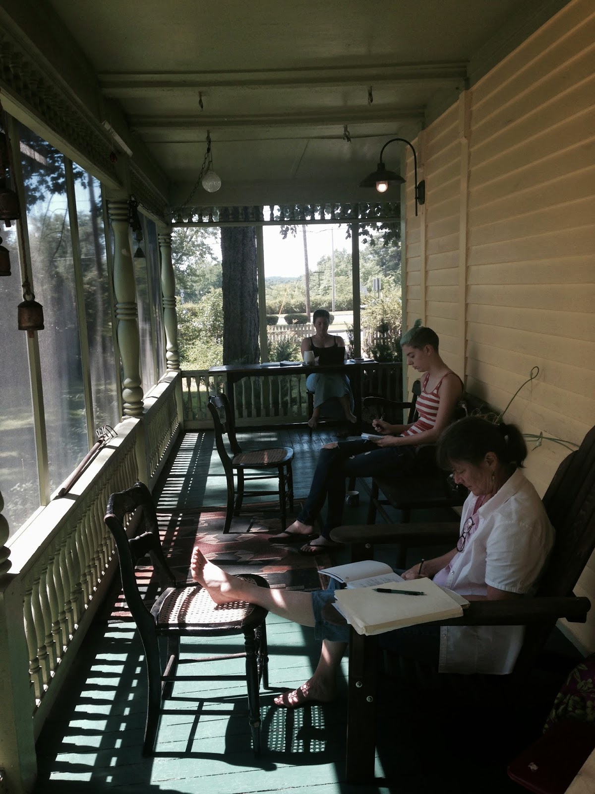 In the mornings, we all gather in what most people would call the living room, but what my kids call the writing room. I give them a prompt, and then we all do 20 minutes or so of Brain Drain longhand. This exercise (Natalie Goldberg calls it Writing Practice and Julia Cameron calls it Morning Pages) creates a hive-like effect in the room, all of us scratching and humming away before we each get up and find a new spot to settle in for the morning's work. All of us are working on our own projects. There's a memoirist (or five), several poets, a phD dissertation writer. Some are beginning projects, some finishing. I feed off the energy of this hive, and I've made good progress on the Big Idea, my novel, though it feels hopeless and impossible, as impossible as trying to keep the weeds out of my labyrinth. The root systems are invincible. ("Salt water and vinegar," says Sierra, whose grandmother is one of those wise women who knows everything, and who has a labyrinth and also raises bees.)