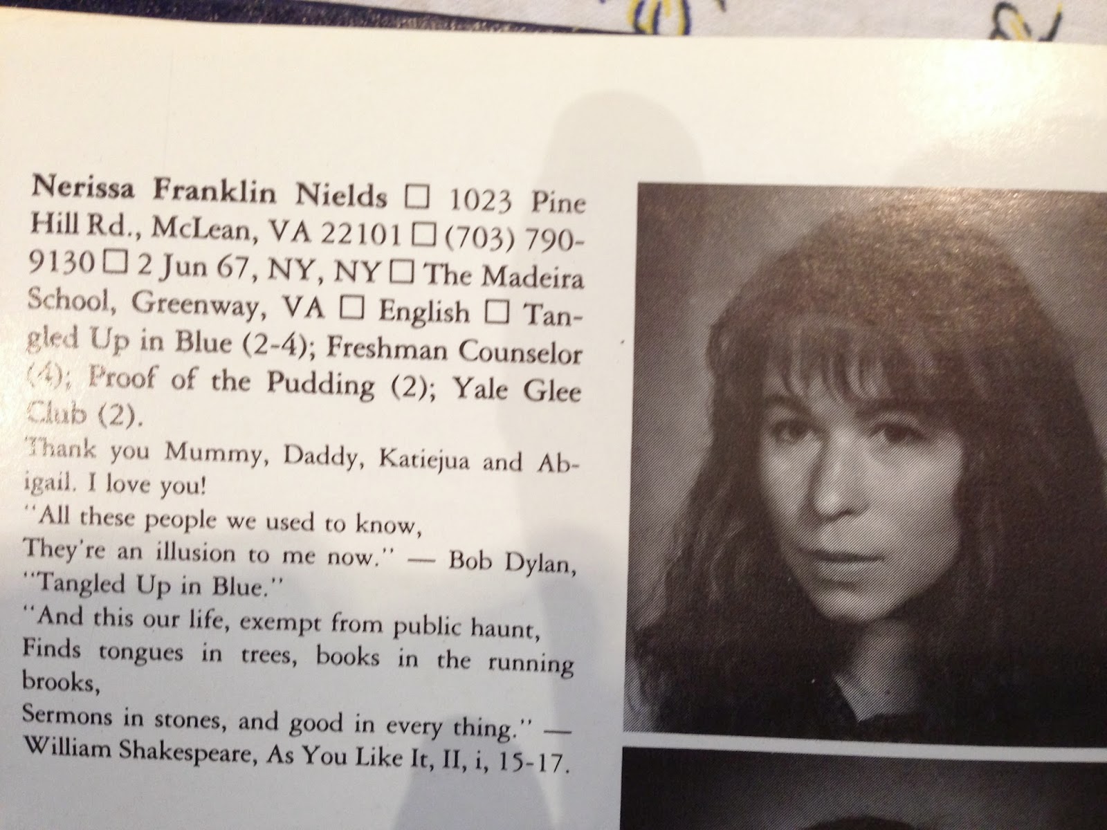 I found my old year book, and next to my photo I'd used as my quotation Dylan's line from "Tangled Up In Blue," "All of these people we used to know/They're an illusion to me now." And I'd thought of that line again, in the week leading up to the reunion. Who were those people? Did they matter to me?