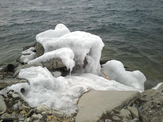 He doesn't say anything about opening a blog posting with a picture of the weather, though: particularly this knobby bit of ice at the end of the Leslie Spit in Toronto, photographed by me, on a freezing cold bike ride there, earlier today.